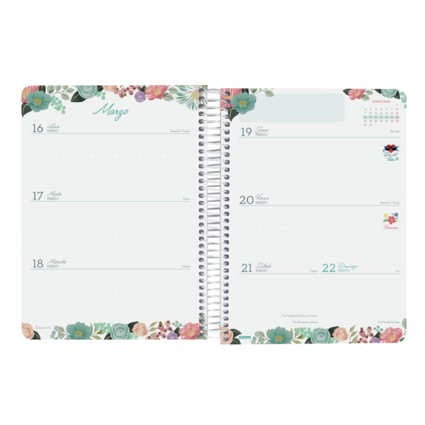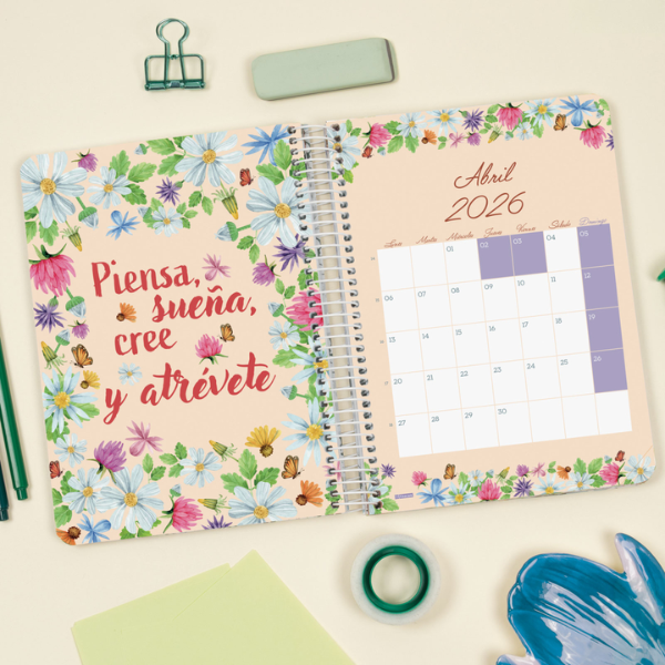 Uno de los detalles más útiles de la Agenda CLOE de Margaritas 16 meses 2025/26 de Finocam son sus esquinas microperforadas, que facilitan encontrar al instante el día o la semana en curso. Además, el interior está diseñado a todo color, lo que convierte cada página en un espacio motivador para plasmar tus ideas, citas y objetivos.