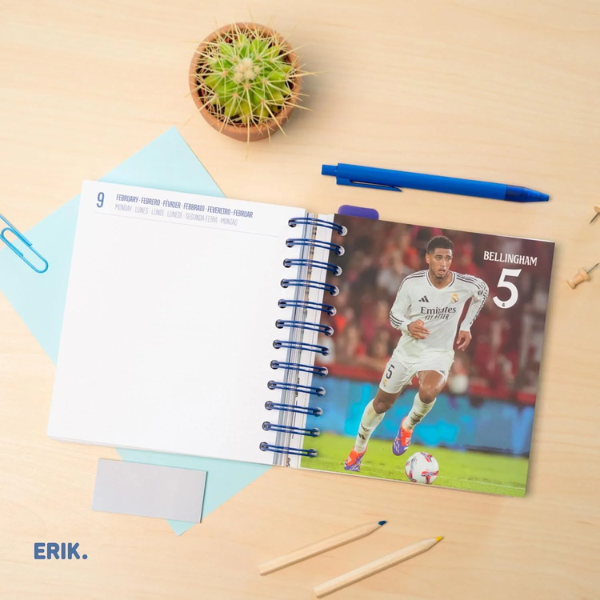 Con un diseño completamente personalizado del Real Madrid, esta agenda combina funcionalidad y pasión por el fútbol. Incluye 324 páginas de papel de 100 g/m², separadores ilustrados, pegatinas exclusivas, bolsillo interior, cubierta personalizable de plástico resistente y encuadernación tipo wire-o con banda elástica para mayor durabilidad.