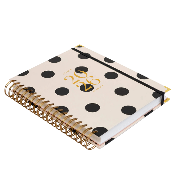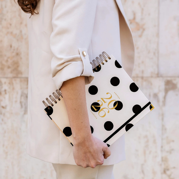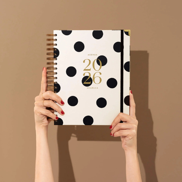 Fabricada en España con amor y sin prisas, la Agenda Diaria 2026 Minimal Grande de Charuca destaca por su diseño sofisticado y atemporal. Su estampado de lunares negros sobre fondo blanco con detalles dorados combina minimalismo y distinción, haciendo de esta agenda una pieza de papelería que no solo es funcional, sino también inspiradora y elegante.
