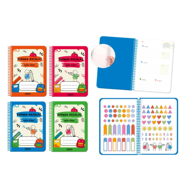 La agenda está disponible en cuatro colores brillantes: rojo, azul, verde y naranja. Si quieres que te enviemos un color específico escríbenoslo en la nota del pedido e intentaremos respetar tu preferencia. Esto permite que cada estudiante elija el diseño que más le guste y se sienta identificado con su herramienta de organización escolar.