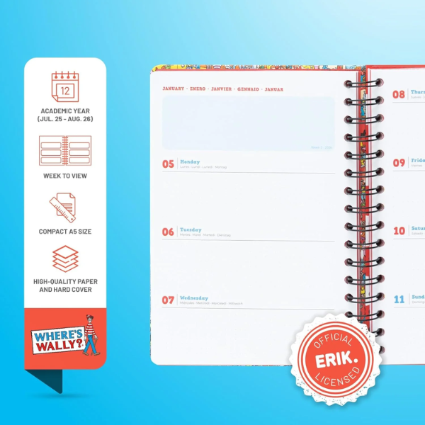 Con la Agenda Escolar Semana Vista 2025-26 Dónde Está Wally A5, cada día de tu curso será más entretenido. Organiza tus estudios con estilo, motivación y un toque de aventura.