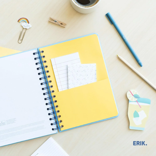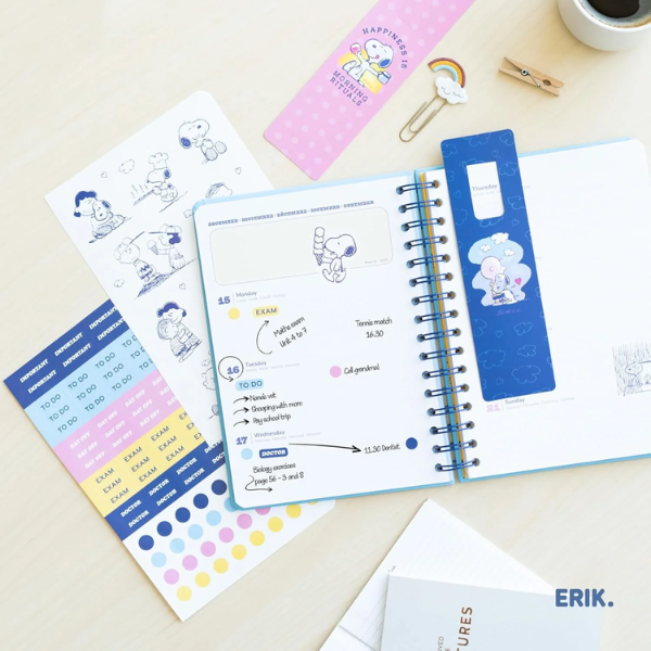 Como detalles adicionales, encontrarás 2 páginas de pegatinas personalizadas con Snoopy, perfectas para marcar fechas especiales, tareas o simplemente decorar. También se incluyen 2 marcapáginas de cartulina personalizados para ayudarte a acceder rápidamente a la semana actual o a secciones importantes, y un bolsillo interior para guardar notas, tickets, papeles sueltos u otros pequeños objetos.