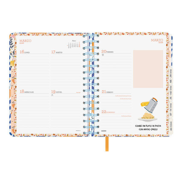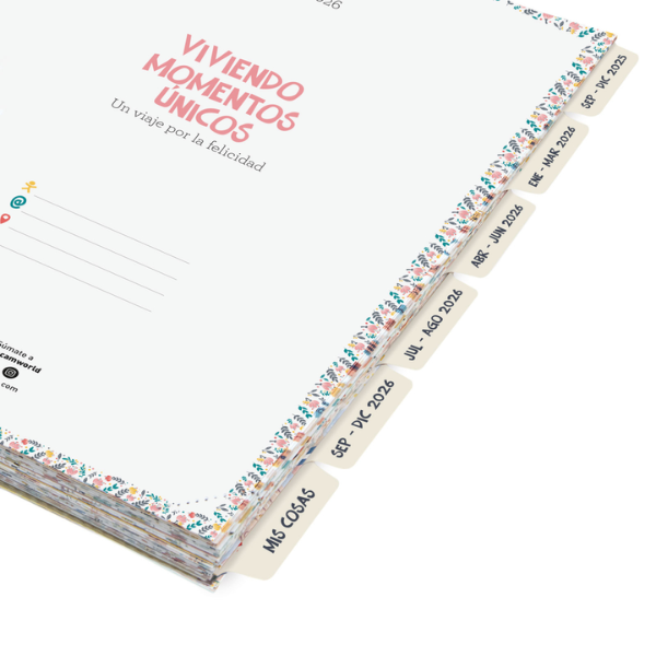 El interior está diseñado para hacer que la organización sea inspiradora y práctica a partes iguales. El diseño está decorado a todo color y dividido en trimestres con separadores decorados, lo que facilita la navegación y aporta un toque visual muy atractivo. Cada semana incluye un espacio llamado “momento único”, un recordatorio para centrarte en el presente y aprovechar cada instante, siguiendo la filosofía de la colección Vitae de Finocam.