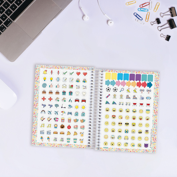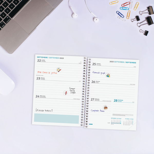 Una de sus características más valoradas son las esquinas microperforadas, que permiten localizar rápidamente el día o la semana en curso sin perder tiempo. Además, viene acompañada de pegatinas temáticas, ideales para personalizar y decorar el interior de la agenda, haciendo de cada página un espacio único y motivador.