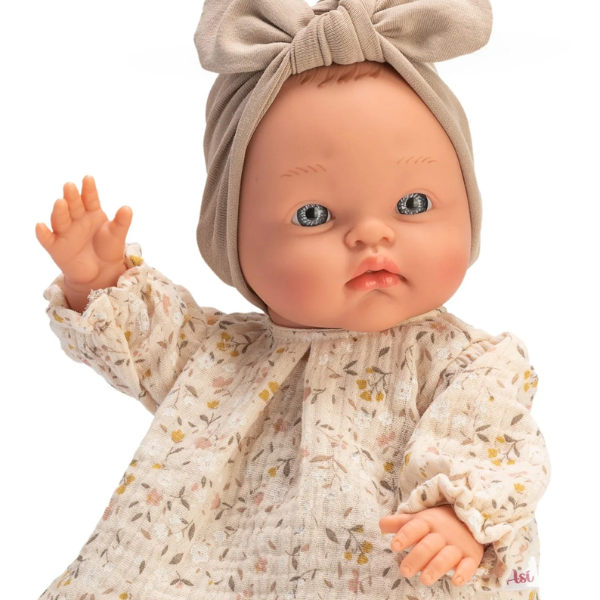 Su diseño incluye ojos claros expresivos que aportan vivacidad y cercanía. Además, es un muñeco pelón, lo que refuerza su estética limpia y facilita su mantenimiento, al mismo tiempo que potencia el juego simbólico de cuidado y atención.