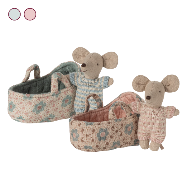 Disponible en dos versiones —azul y rosa—, el Bebé Ratón en Capazo es el compañero ideal para jugar, soñar y crear historias llenas de ternura.