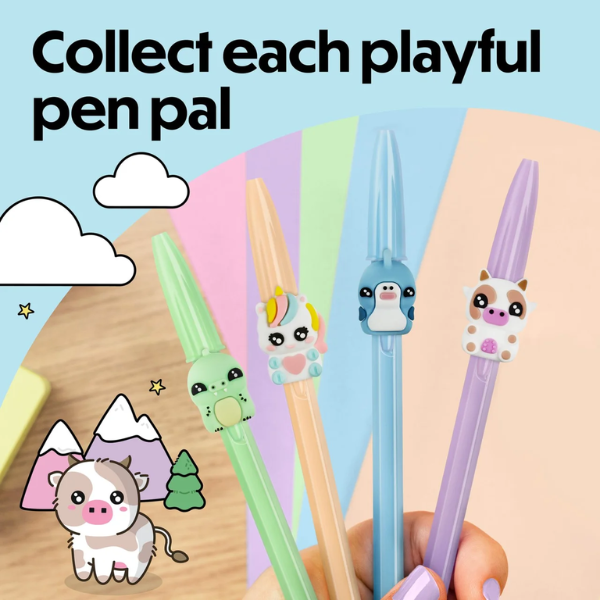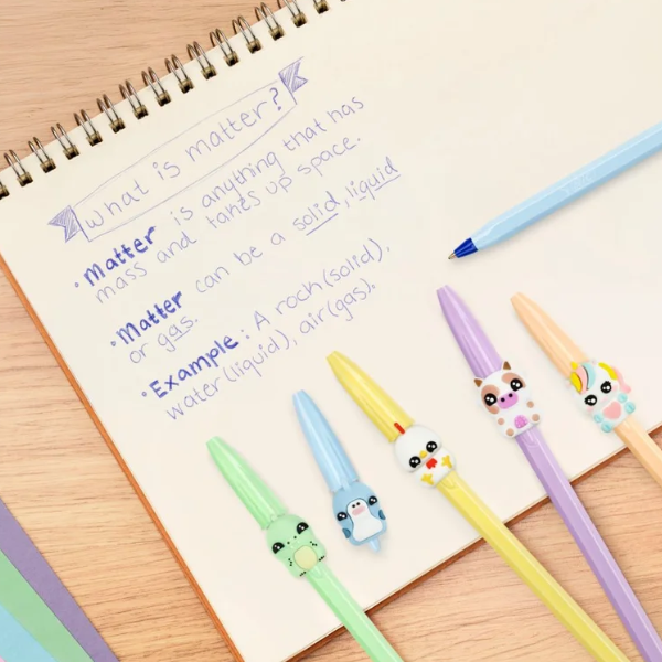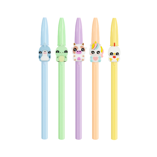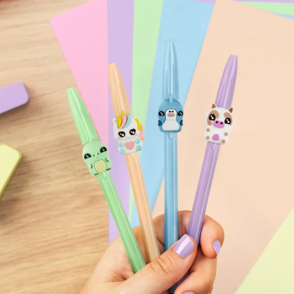 La colección incluye cinco modelos diferentes: tiburón, dinosaurio, vaca, unicornio y gallina. Cada uno tiene su propia personalidad y diseño, lo que convierte estos bolígrafos en objetos coleccionables. El modelo se envía de forma aleatoria según disponibilidad, añadiendo un elemento sorpresa a cada compra.