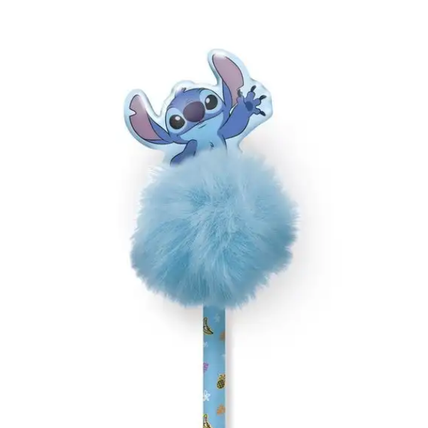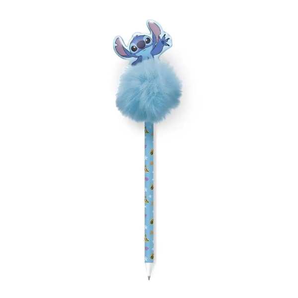 Este bolígrafo azul de tinta destaca por su diseño alegre y llamativo. Está rematado con un pompón de felpa de pelo largo, suave y voluminoso, que añade textura y color. Encima del pompón se encuentra un topper de PVC con la carita de Stitch, el experimento 626, en versión tropical. El diseño es perfecto para coleccionistas o para regalar a los amantes del mundo Disney.