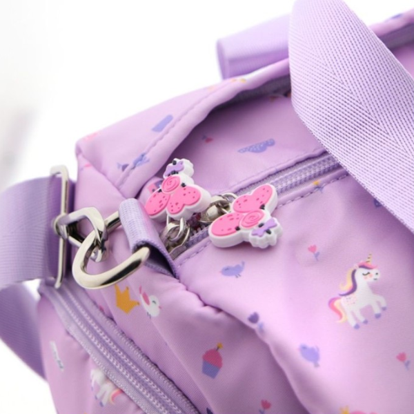 Su diseño no solo enamora por su estética, sino que también ofrece una estructura cómoda y funcional para adaptarse a las necesidades de los niños. Está equipada con dos asas cortas para llevar en la mano y una asa larga ajustable para colgar al hombro o cruzar, permitiendo diferentes formas de transporte según la edad del niño o el tipo de trayecto.