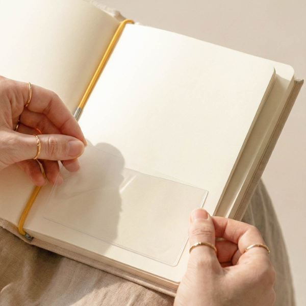 Gracias a su formato autoadhesivo, se pueden colocar fácilmente en el interior de tu cuaderno, ya sea en la cubierta o en páginas específicas. Esto permite crear espacios de almacenamiento personalizados según tus necesidades, adaptando tu sistema de organización de forma totalmente flexible.