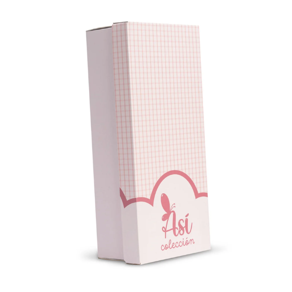 El Bomboncín Vestido Flores Rosas Chaqueta Beige se presenta en una bonita caja adaptada a su tamaño, ideal tanto para regalar como para conservar el muñeco cuando no se está utilizando. Este detalle lo convierte en una opción muy atractiva para ocasiones especiales.