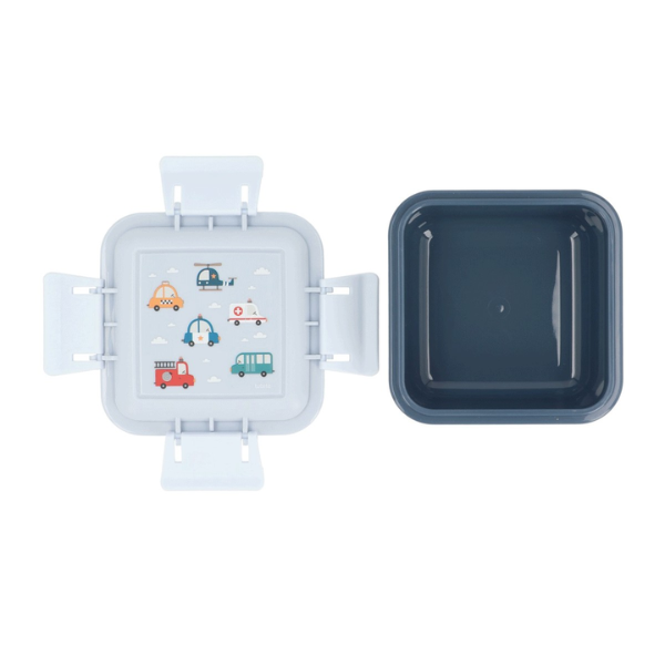 La Cajita Almuerzo City Cars está equipada con un práctico sistema de cierre de 4 lengüetas, que permite a los niños abrirla y cerrarla sin ayuda, promoviendo su autonomía y coordinación motora. La tapa es hermética, lo que asegura que los alimentos se mantendrán protegidos durante el transporte, sin riesgo de derrames.
