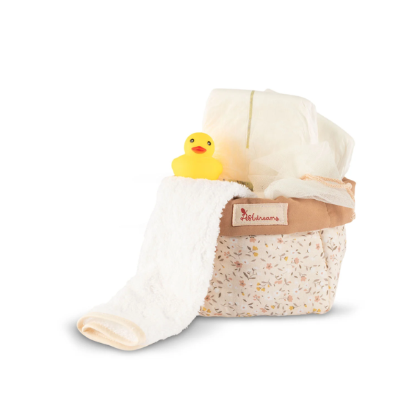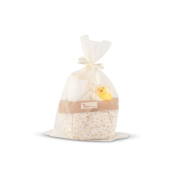 Incluye: 2 pañales, 1 toallita de rizo, 1 esponja de tul, 1 patito amarillo