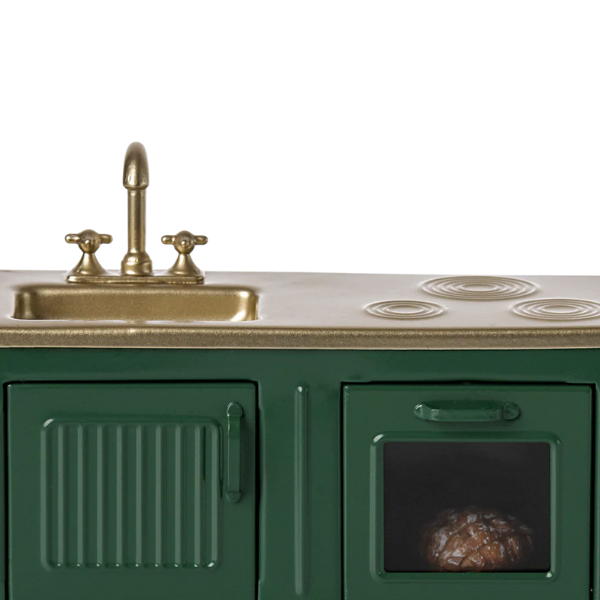Fabricada con metal y polyresina, la Cocina Ratón Verde Oscuro destaca por su resistencia y por la atención al detalle que caracteriza a todos los productos Maileg. Su estructura presenta una puerta de gabinete abatible, un fregadero metálico y un horno con un pastel recién horneado en su interior, que aporta un toque mágico y realista al juego. Esta cocina invita a los pequeños (y a los coleccionistas adultos) a imaginar deliciosas historias de comidas familiares, meriendas y momentos cotidianos llenos de calidez.