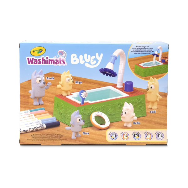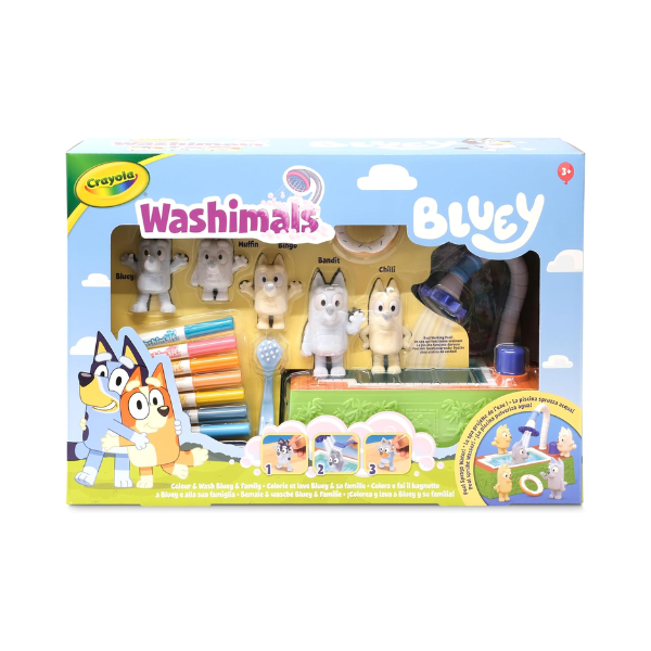El Crayola Washimals Bluey es el set creativo definitivo para los pequeños fans de Bluey y para quienes adoran las actividades artísticas llenas de imaginación. Esta edición especial amplía la encantadora familia Washimals incorporando a los personajes más queridos del famoso dibujo animado: Bluey, Bingo, Muffin, Chilli y Bandit. Cada uno de estos cachorros aterciopelados invita a los niños a sumergirse en horas de creatividad, coloreando, cuidando y bañando a sus nuevos amigos una y otra vez.