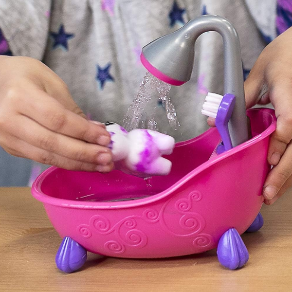 Una de las características más emocionantes del Crayola Washimals Pets con Bañera es su ducha funcional. Basta con llenar el bote de agua y presionar el botón para que el agua salga por la ducha, permitiendo lavar a los cachorros de forma realista. Este proceso convierte el baño en una actividad interactiva y encantadora, estimulando el juego simbólico y la imaginación infantil. El set también incluye un cepillito de baño perfecto para eliminar la tinta con suavidad.