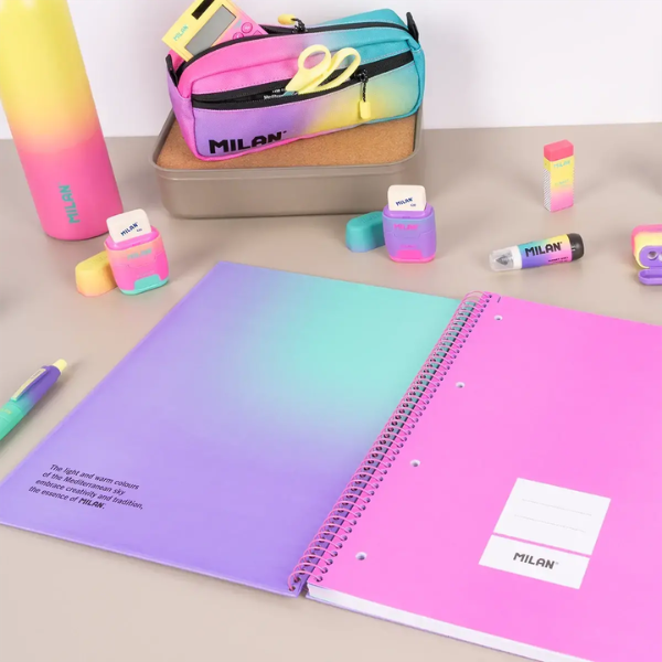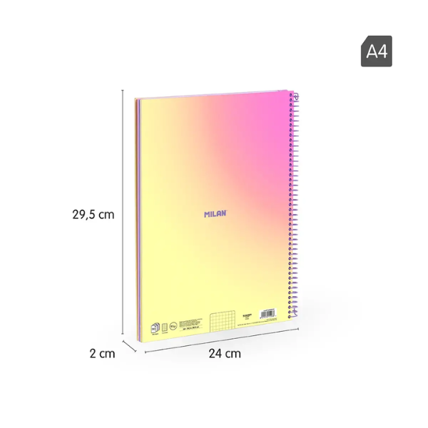 El Cuaderno A4 con Espiral y Tapa Dura Papel Cuadriculado Sunset Milan combina funcionalidad, estilo y sostenibilidad, convirtiéndose en el compañero ideal para estudiantes, profesionales y creativos. Con 90 hojas cuadriculadas y resistentes, este cuaderno de formato A4 ofrece un soporte perfecto para notas, esquemas, diagramas y bocetos, al tiempo que aporta un toque de diseño moderno gracias a su colección Sunset, inspirada en los degradados cálidos de los atardeceres mediterráneos.