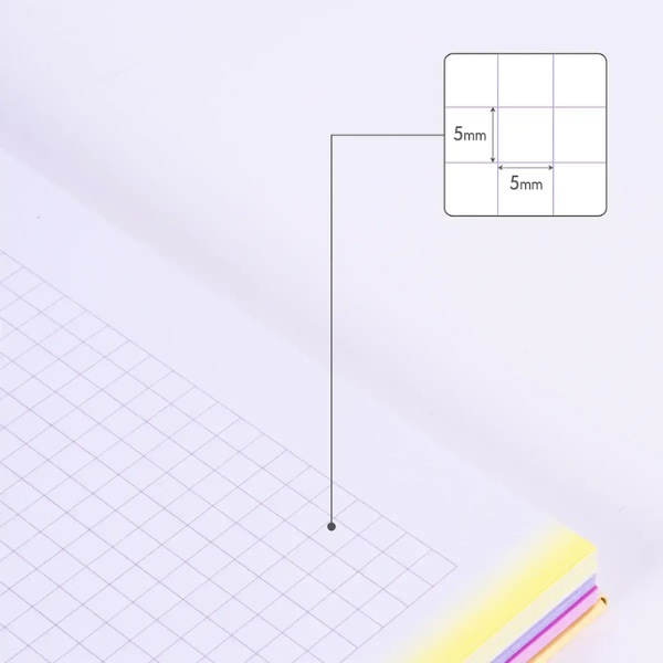 Hojas: 90 cuadriculadas 5×5 mm, 3 bandas de color (30 hojas por color)