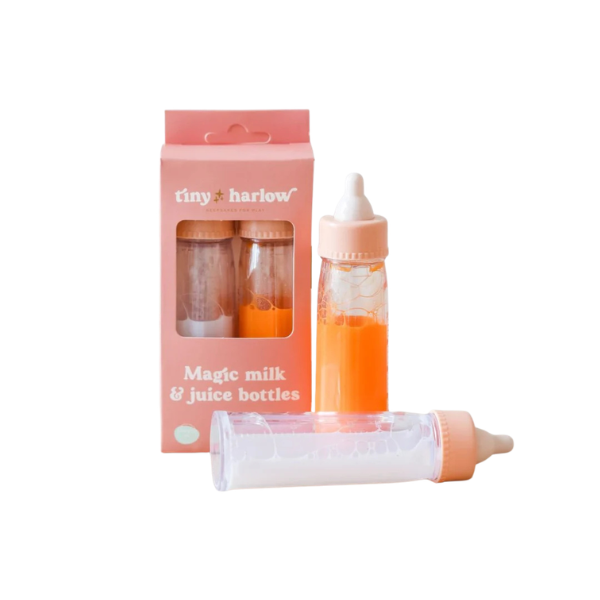 La marca Tiny Harlow, de origen australiano, destaca por crear accesorios de alta calidad con diseños inspirados en los años 90. Sus productos están pensados para potenciar el juego imaginativo y el desarrollo del cuidado en los niños. El Dúo de Biberones Mágicos Leche y Zumo de Frutas para Muñecos refleja perfectamente esta filosofía.