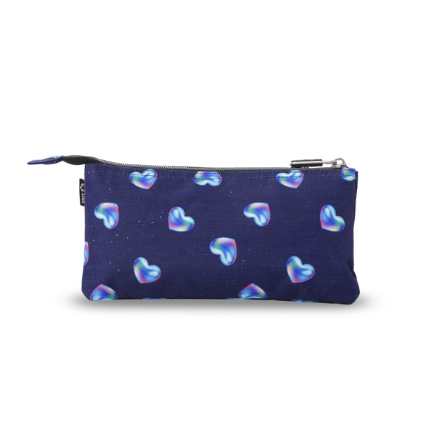 Su diseño tipo Tablero Glitter incorpora un estampado de corazones en tonos azules que aporta un estilo dulce, actual y fácilmente reconocible. Este acabado no solo lo convierte en un estuche visualmente atractivo, sino también en un complemento que combina perfectamente con mochilas y otros accesorios escolares de la misma línea.