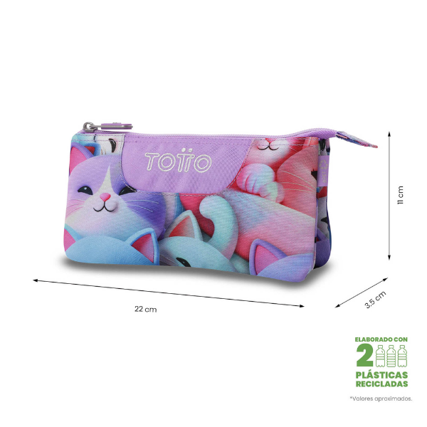 Con unas dimensiones de 22 x 11 x 3,5 cm y una capacidad aproximada de 0,85 litros, el Estuche Escolar Triple Gatos Kawaii Totto ofrece un equilibrio perfecto entre tamaño compacto y capacidad de almacenamiento. Es ligero, fácil de transportar y se adapta perfectamente a cualquier mochila escolar.