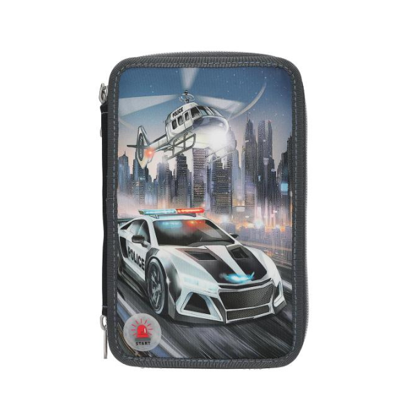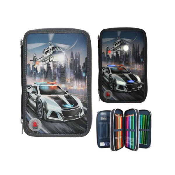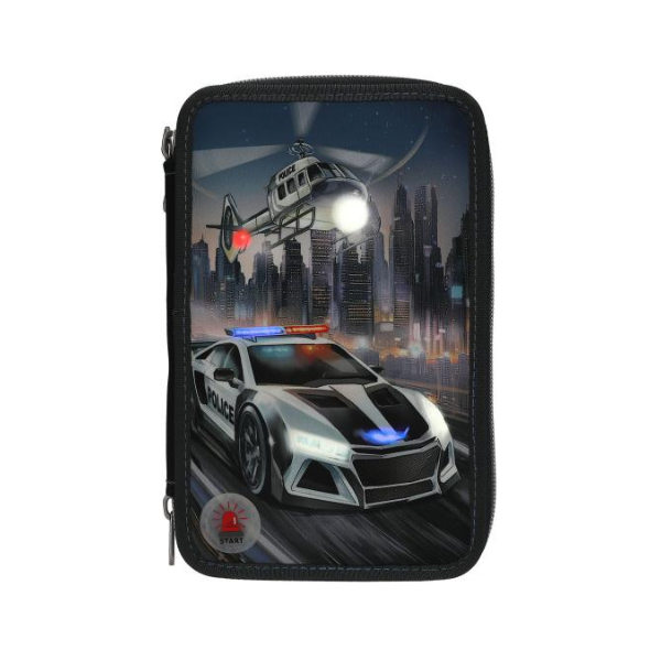 Lo primero que llama la atención del Estuche triple LED Monster Cars policía es su impresionante diseño frontal. En él se representa una escena nocturna de alto voltaje con un coche de policía de carreras y un helicóptero surcando el cielo sobre una ciudad iluminada. Este diseño no solo es visualmente impactante, sino que cobra vida con luces LED: al presionar el botón de encendido, las luces azules y los faros delanteros del coche parpadean durante unos 20 segundos, simulando una verdadera persecución policial.
