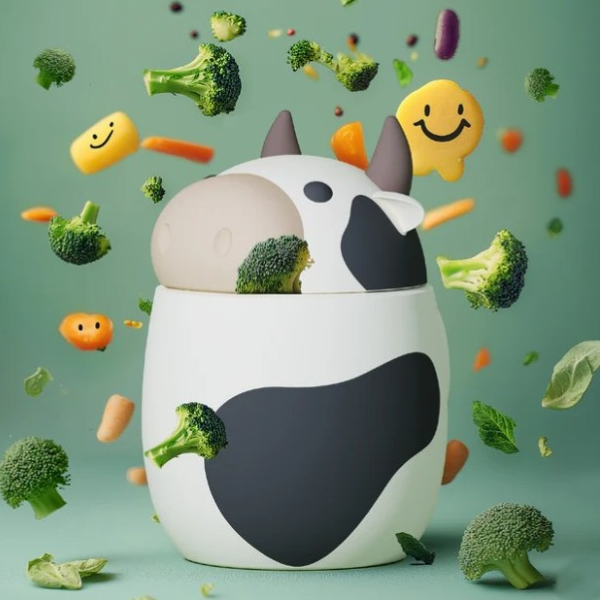 Diseño divertido y original: Con forma de vaca blanca con manchas negras y tapa con la cara de la vaca.