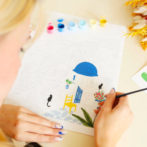 El kit incluye una hoja de cartulina de alta calidad (24,5 x 32,5 cm) con el boceto numerado listo para pintar. Cada número corresponde a uno de los 17 pequeños botes de pintura incluidos, lo que facilita seguir el diseño paso a paso sin necesidad de experiencia previa. La pintura, de textura suave y acabado mate, ofrece un resultado pigmentado y luminoso que realza los colores característicos de Santorini.