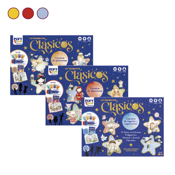 El Kit Proyector Clásicos Imagiland está disponible en tres temáticas diferentes: Cuentos de Aventuras, Cuentos de Princesas y Cuentos de Ingenio y Superación. Cada modelo cuenta con historias, marionetas y diapositivas distintas, lo que permite elegir la opción que mejor se adapte a los intereses del niño.