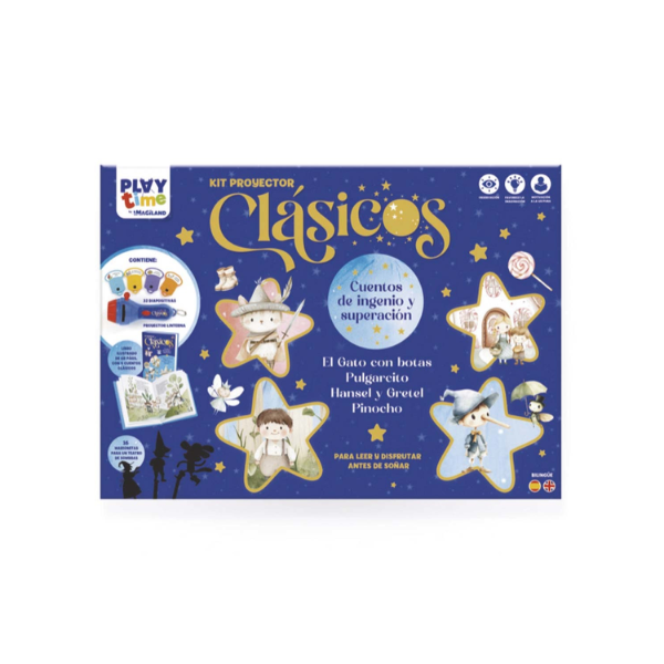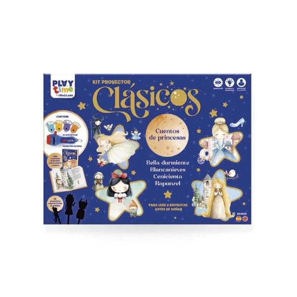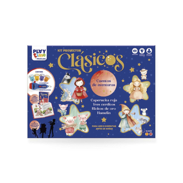 El Kit Proyector Clásicos Imagiland incluye un libro ilustrado con cuatro cuentos clásicos disponibles en español e inglés, lo que permite a los niños familiarizarse con ambos idiomas de forma natural y entretenida. Esta doble versión favorece el aprendizaje bilingüe, ayudando a mejorar la comprensión lectora y el vocabulario desde edades tempranas.