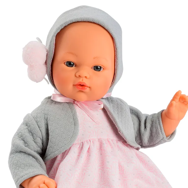 Este modelo se presenta con un bonito conjunto formado por un vestido rosa y una chaqueta gris, una combinación elegante y actual que aporta personalidad al muñeco. Gracias a la amplia variedad de ropa compatible disponible, los niños pueden cambiar su estilo fácilmente, ampliando las posibilidades de juego y estimulando la creatividad.