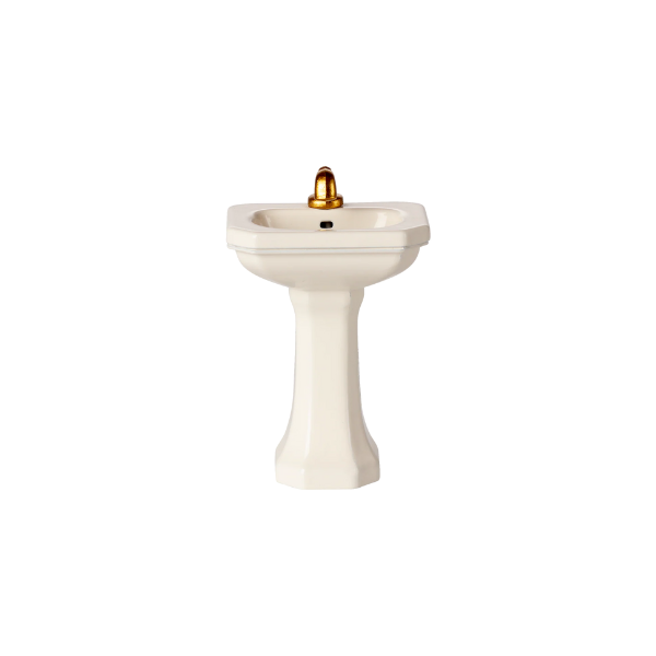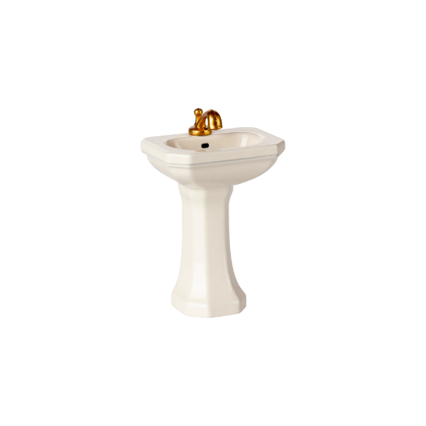 Este lavabo en miniatura destaca por su estructura metálica sólida y su acabado artesanal, que reproduce fielmente los lavabos antiguos de porcelana esmaltada. Su tono blanco roto, con un ligero matiz crema, aporta un aire cálido y sofisticado que combina a la perfección con otros accesorios Maileg como la Mini Bañera Ratón, la Plancha y Tabla de Planchar Ratón, o el Frigorífico Ratón Blanco Roto.