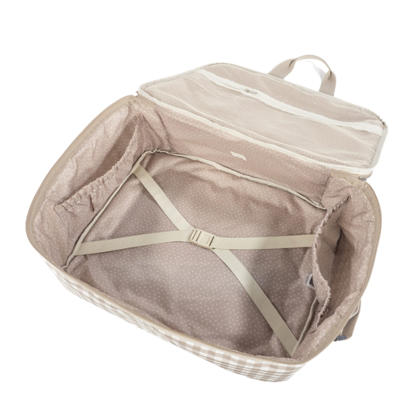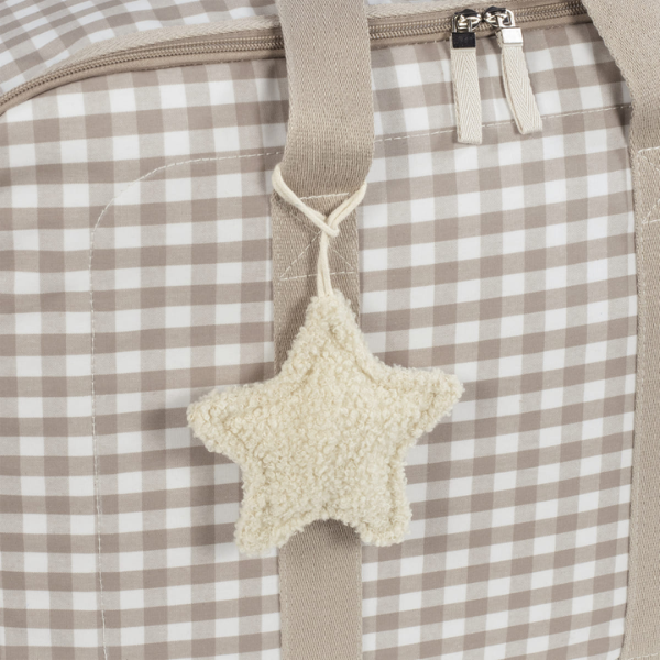 El interior de la Maleta Caetana Sand Walking Mum está cuidadosamente diseñado para maximizar la organización. Incluye un forro interior a juego con bandas elásticas que permiten sujetar la ropa y los accesorios, manteniéndolos ordenados y en su sitio durante todo el trayecto. Para añadir un toque personal, la maleta viene con un colgante en forma de estrella, pensado para bordar el nombre de tu bebé y personalizar el accesorio de una manera única y especial.