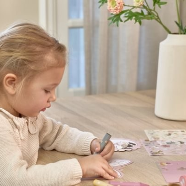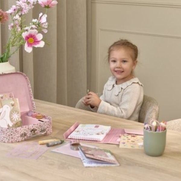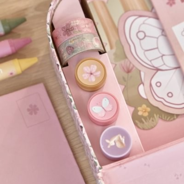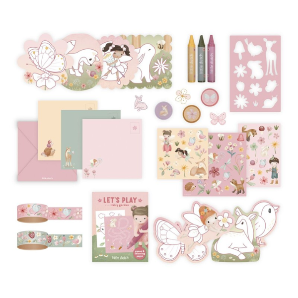 La Maleta de Creatividad Fairy Garden Little Dutch incluye una amplia variedad de materiales creativos como hojas de diferentes formas, crayones, pegatinas, sellos y otros accesorios pensados para estimular la creatividad. Gracias a esta completa selección, los niños pueden experimentar con distintas técnicas y desarrollar sus propias ideas artísticas.