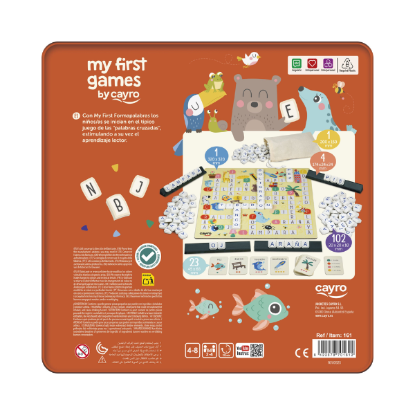 Gracias a su formato compacto (26,5 x 26,5 x 6 cm), el Mi Primer Juego de Palabras Cayro es fácil de transportar, siendo ideal para llevar de viaje o utilizar en el aula.