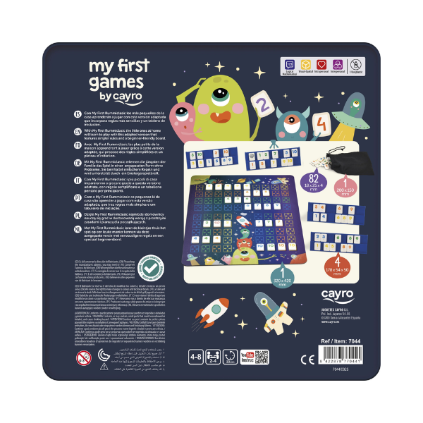 Con unas medidas de envase de 26,5 x 26,5 x 6 cm, el Mi Primer Rummi Cayro es compacto, práctico y fácil de guardar.