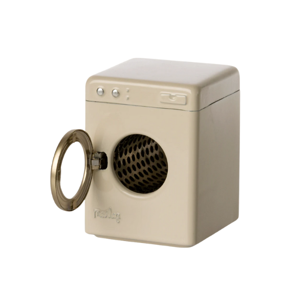 Fabricada completamente en metal y pintada en un delicado tono blanco hueso, la Mini Lavadora Ratón destaca por su acabado artesanal, sus líneas suaves y su aspecto realista. Cada detalle ha sido cuidadosamente trabajado para reproducir el aspecto de una lavadora tradicional, adaptado al tamaño perfecto para las pequeñas figuras Maileg.