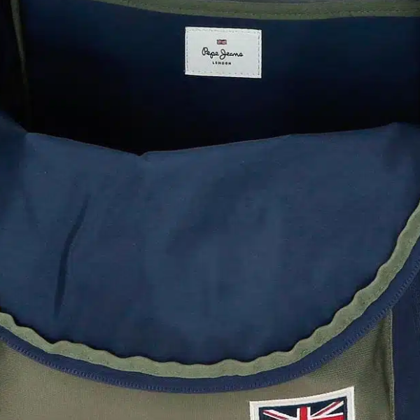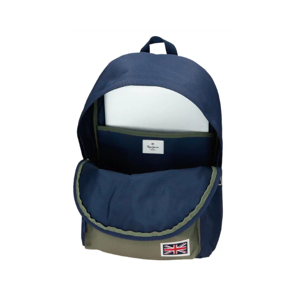 La Mochila 44cm Adaptable a Carro Arwyn Marino Pepe Jeans es una mochila escolar diseñada para ofrecer el máximo equilibrio entre funcionalidad, resistencia y estilo. Perteneciente a la colección Arwyn de Pepe Jeans, este modelo destaca por su estética en tonos azul marino y caqui, una combinación sobria, moderna y muy versátil que se adapta a cualquier estilo. El diseño incorpora el característico detalle de la bandera de Inglaterra, sello distintivo de la marca que aporta identidad y un acabado reconocible.