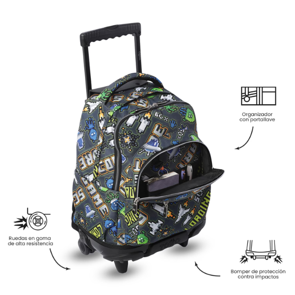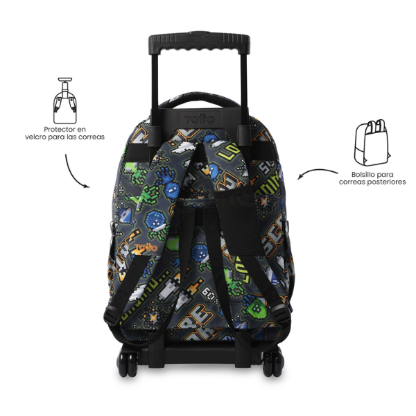 El diseño arcade aporta un estilo juvenil y dinámico, perfecto para estudiantes que buscan una mochila diferente, funcional y atractiva al mismo tiempo.