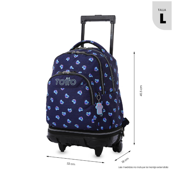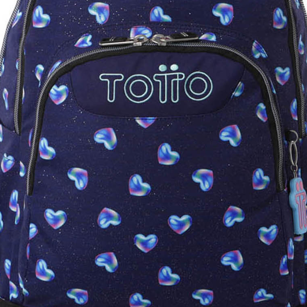 El diseño de la Mochila Escolar con Ruedas Desmontable Corazones Azul Totto es uno de sus grandes atractivos. Su estampado de corazones en tonos azules aporta un estilo dulce, moderno y juvenil, ideal para estudiantes que buscan una mochila práctica sin renunciar a un toque de personalidad. Los detalles brillantes de la versión “Glitter” añaden un acabado especial que la hace aún más llamativa.