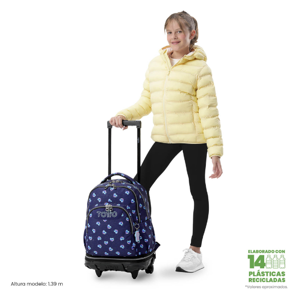 La Mochila Escolar con Ruedas Desmontable Corazones Azul Totto es una opción versátil, resistente y con un diseño encantador que combina funcionalidad escolar avanzada con un estilo dulce y moderno. Pensada para el ritmo diario del colegio, esta mochila 2 en 1 permite utilizarla tanto como mochila tradicional como trolley con ruedas, adaptándose a cualquier situación de forma práctica.