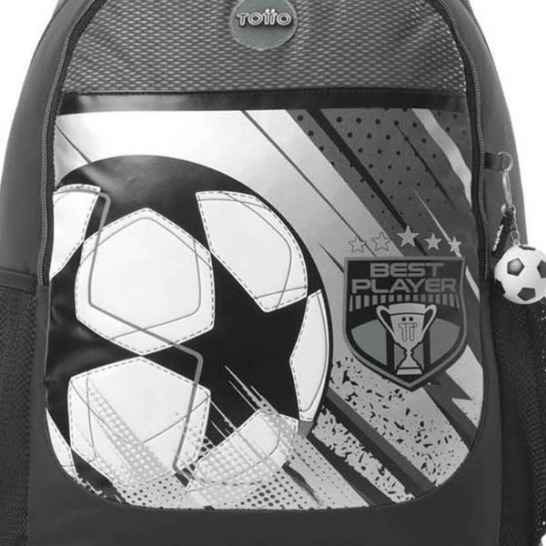 Su diseño frontal estampado, con gráficos de fútbol en tonos oscuros y detalles inspirados en el juego, convierte a la Mochila Escolar con Ruedas Fútbol Totto en un accesorio ideal para quienes viven el deporte dentro y fuera del aula. Además, incluye un llavero en forma de balón que refuerza su estética futbolera y aporta un toque divertido y distintivo.