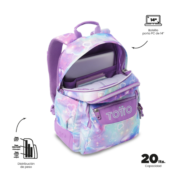 Pensada para el uso escolar diario, la Mochila Escolar Infantil Corazones Lila Totto ofrece una capacidad de 20 litros, permitiendo transportar cómodamente libros, cuadernos y todo el material necesario para la jornada. Su compartimento principal es amplio y funcional, diseñado para mantener el contenido organizado y accesible.