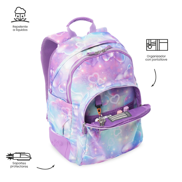 Además, incorpora un organizador interno con portallaves, facilitando la distribución de pequeños objetos como estuches, llaves o accesorios escolares. Este sistema mejora la organización interna y evita el desorden, optimizando el uso del espacio.