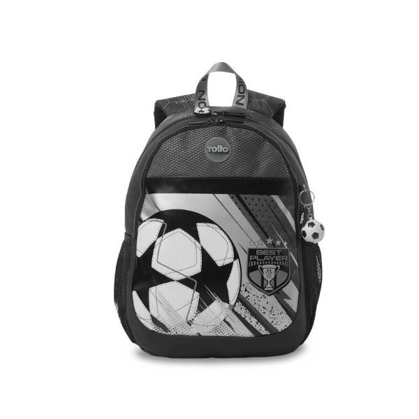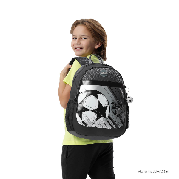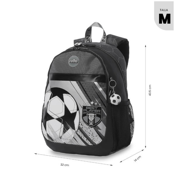 Un detalle distintivo de este modelo es su llavero en forma de pequeño balón de fútbol, que refuerza su temática deportiva y añade un toque divertido que encanta a los más pequeños. Este tipo de detalles hacen que la mochila no solo sea funcional, sino también atractiva y personal.