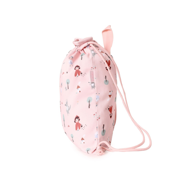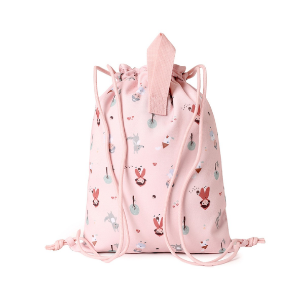 El sistema de cierre con cordón ajustable en los laterales permite abrir y cerrar la mochila fácilmente, y también se utiliza como asas para llevarla cómodamente colgada a la espalda. Su formato tipo saco la hace muy intuitiva para los más pequeños, ayudando a fomentar su autonomía desde temprana edad.