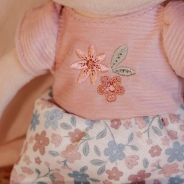 La Muñeca Blandita Rosa Little Dutch destaca por su diseño dulce y cuidado. Rosa lleva un precioso conjunto compuesto por una falda de flores alegre, una camiseta suave y unas botitas con pompón que aportan un toque encantador. Su cabello, decorado con pequeños moños y lazos, completa una estética adorable que conquista a primera vista.