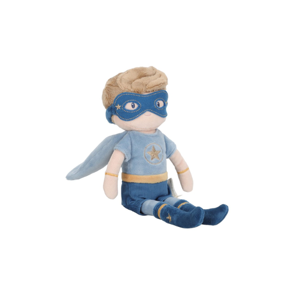El Muñeco Blandito Jim Superhéroe Little Dutch destaca por su diseño original y lleno de detalles. Jim luce una divertida máscara de superhéroe, una suave capa y elegantes detalles dorados que aportan un toque mágico y aventurero. Su apariencia amigable y su expresión dulce invitan a los niños a interactuar con él desde el primer momento.