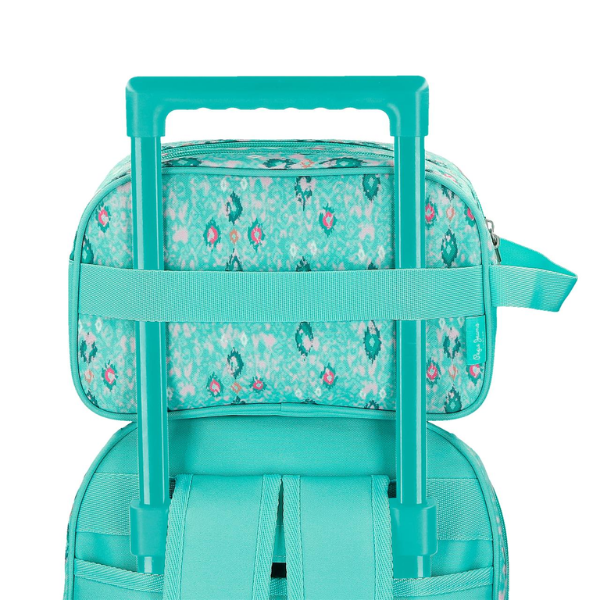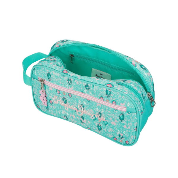 Además, incorpora un pequeño bolsillo lateral adicional, ideal para guardar objetos de menor tamaño que requieren acceso frecuente, como pañuelos, gomas de pelo o pequeños accesorios. Esta funcionalidad extra convierte al Neceser 2 Cremalleras Sun Turquesa Verde Pepe Jeans en una solución práctica para quienes valoran la organización detallada.
