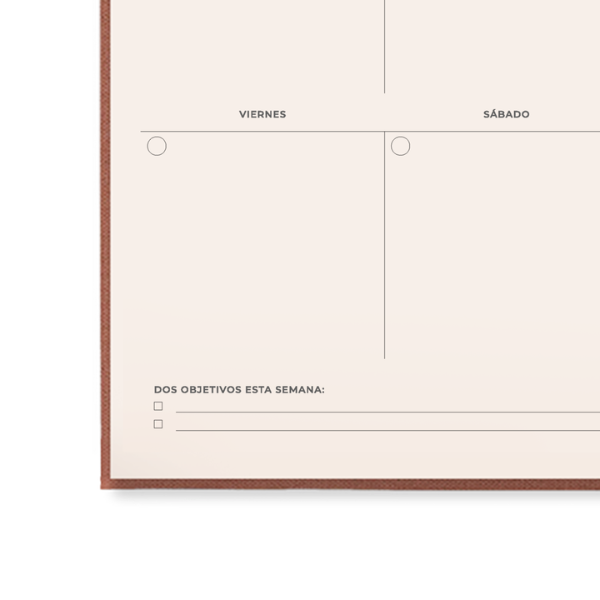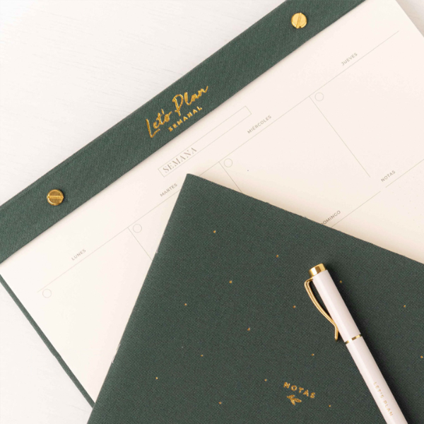 Si buscas un Notepad Semanal Let’s Plan que te permita visualizar toda tu semana de un vistazo y gestionar tus prioridades con claridad, este modelo está pensado para ti. Su acabado entelado en tela efecto lino aporta elegancia y resistencia, mientras que los detalles en dorado —stamping en portada y encuadernación con tornillos— aportan un toque sofisticado y distintivo que hace que planificar sea un placer.